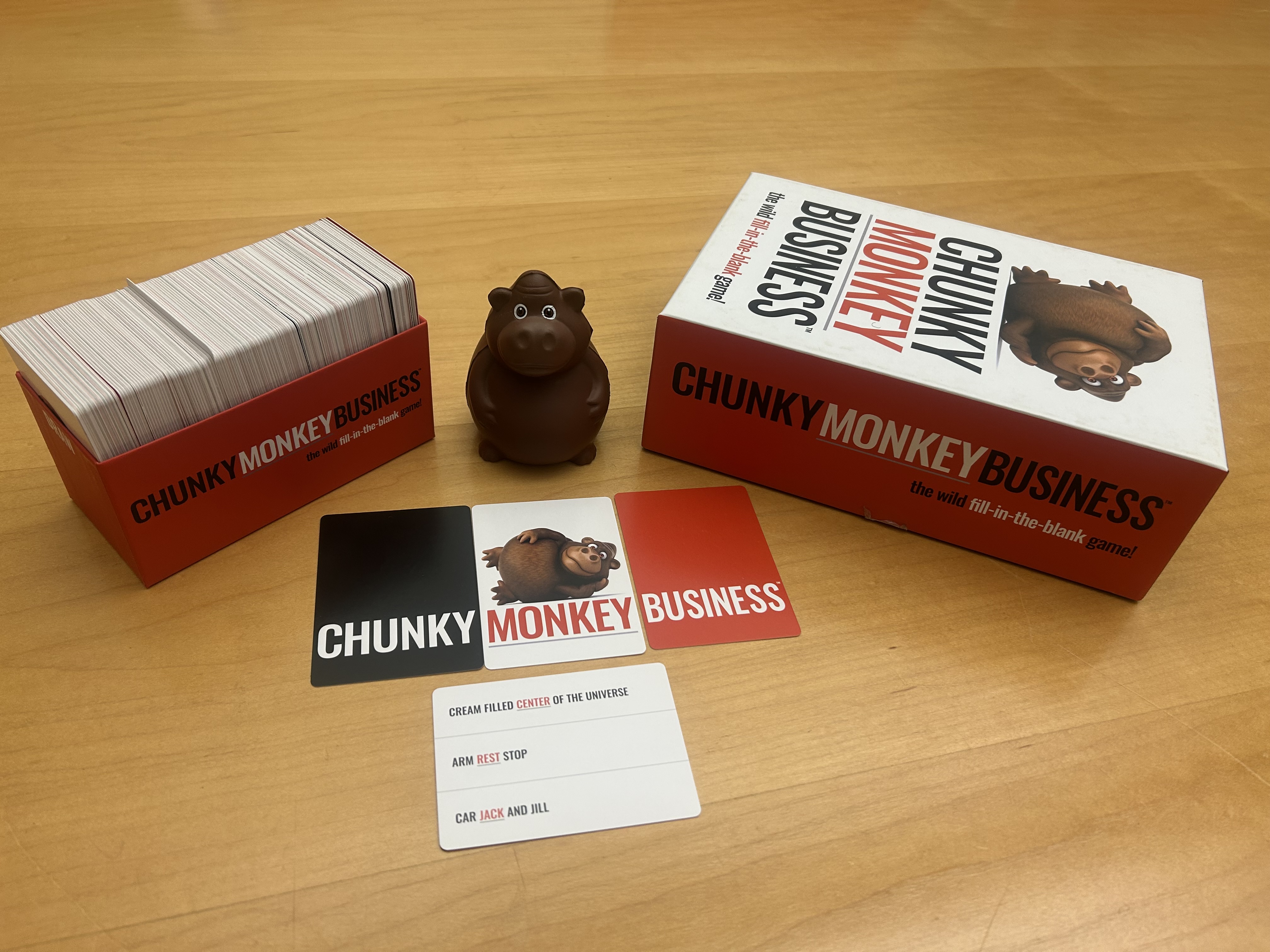 Chunky Monkey Business is a 3-8 player word guessing game similar to the popular New York Times Connections game. The game consists of a chunky rubber monkey and a handful of cards with the words “Chunky” “Monkey” and “Business” on the back, along with three different prompts to read off each card. The reader selects one prompt to read out loud to the players, avoiding the ‘Connector word’ which is located in between two phrases and links the first and last phrase together (ex. Down for the count Dracula) a player who thinks they have the right answer grabs the chunky monkey from the center of the table and announces their guest. If they get the connector word correct, they get the card. If they are wrong, the reader gets the card. If all players are stumped, the reader can begin to slowly read out the connector word until someone makes a guess. The first player to collect three cards that spell out “Chunky Monkey Business” wins! Chunky Monkey Business is a very simple game of fun wordplay that is sure to be entertaining to word lovers and anyone who appreciates a groan-worthy pun.