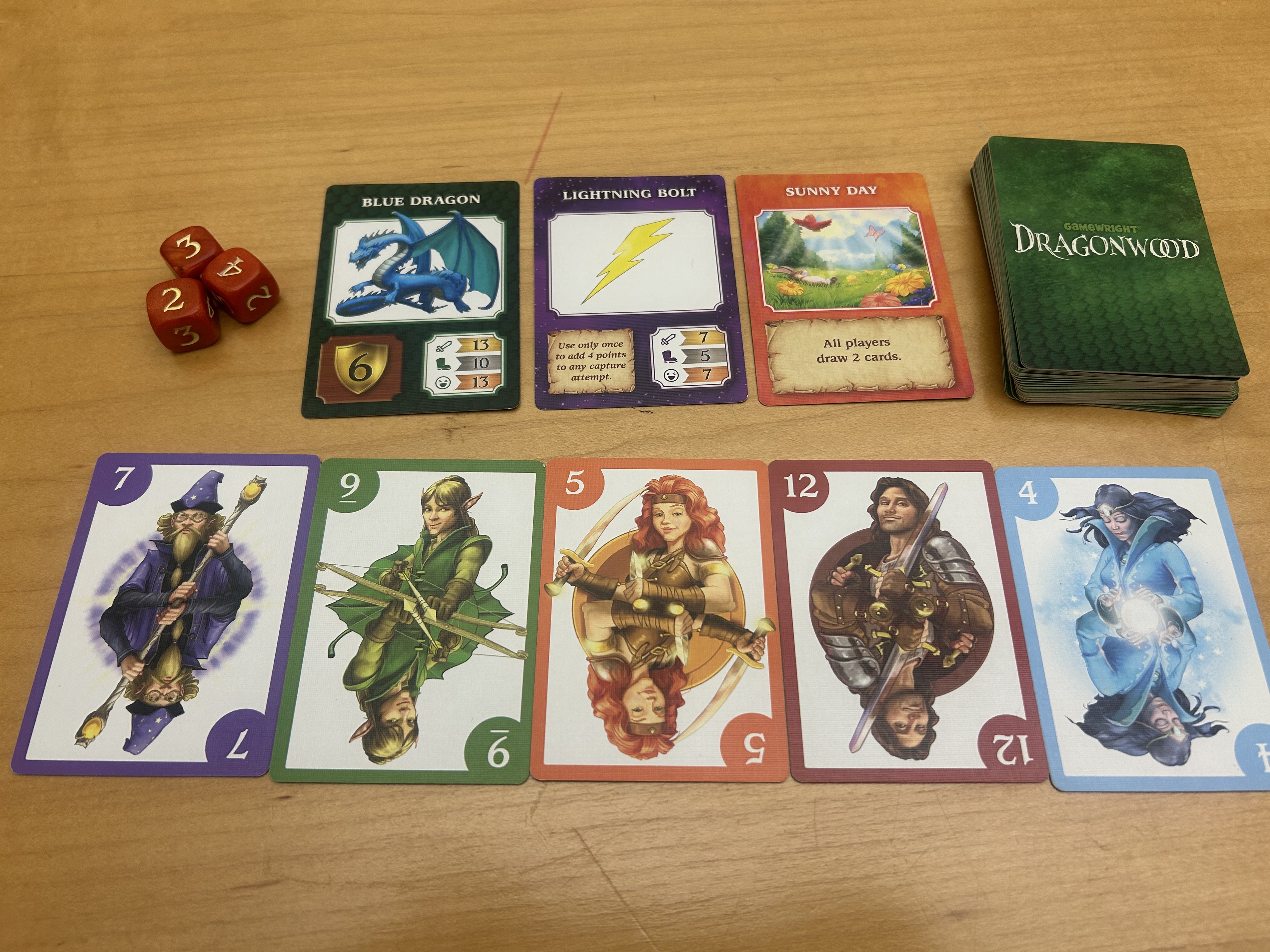 Dragonwood is a 2-4 player game in which players journey through a magical forest infested with monsters, treasures, and dragons all to earn the most victory points. Dragonwood is a combination of strategic card use and lucky dice rolls. The main deck consists of Adventurer Cards with the colors of blue, purple, red, orange, and green all numbered 1-12. By playing Adventurer cards in three different combinations, Strike (in a row numerically), Stomp (all the same number), or Scream (same color), players can have an opportunity to capture a Dragonwood Card based on a dice roll equal to the number of cards used in a Strike, Stomp, or Scream (ex. If you played a Scream with four cards you would roll four dice). The resulting value must be equal to or greater than a Dragonwood Card’s threshold if a player used a Strike, Stomp, or Scream to capture the card. If a player does not want to capture a card that can always draw one card from the Adventurer deck and add it to their hand. The Dragonwood Cards consist of ferocious creatures, helpful enchantments, and disastrous events that shake up the board state. When the deck runs dry, the player with the most victory points wins the game. Dragonwood’s art is seeped in fairy tale mythology with bow-wielding elves and green globs of living slime, and its gameplay is simple yet allows a player to think and consider a strategy of getting quick captures or saving up to get an especially beneficial card, makes for an engaging game that anyone looking for something new is sure to enjoy.