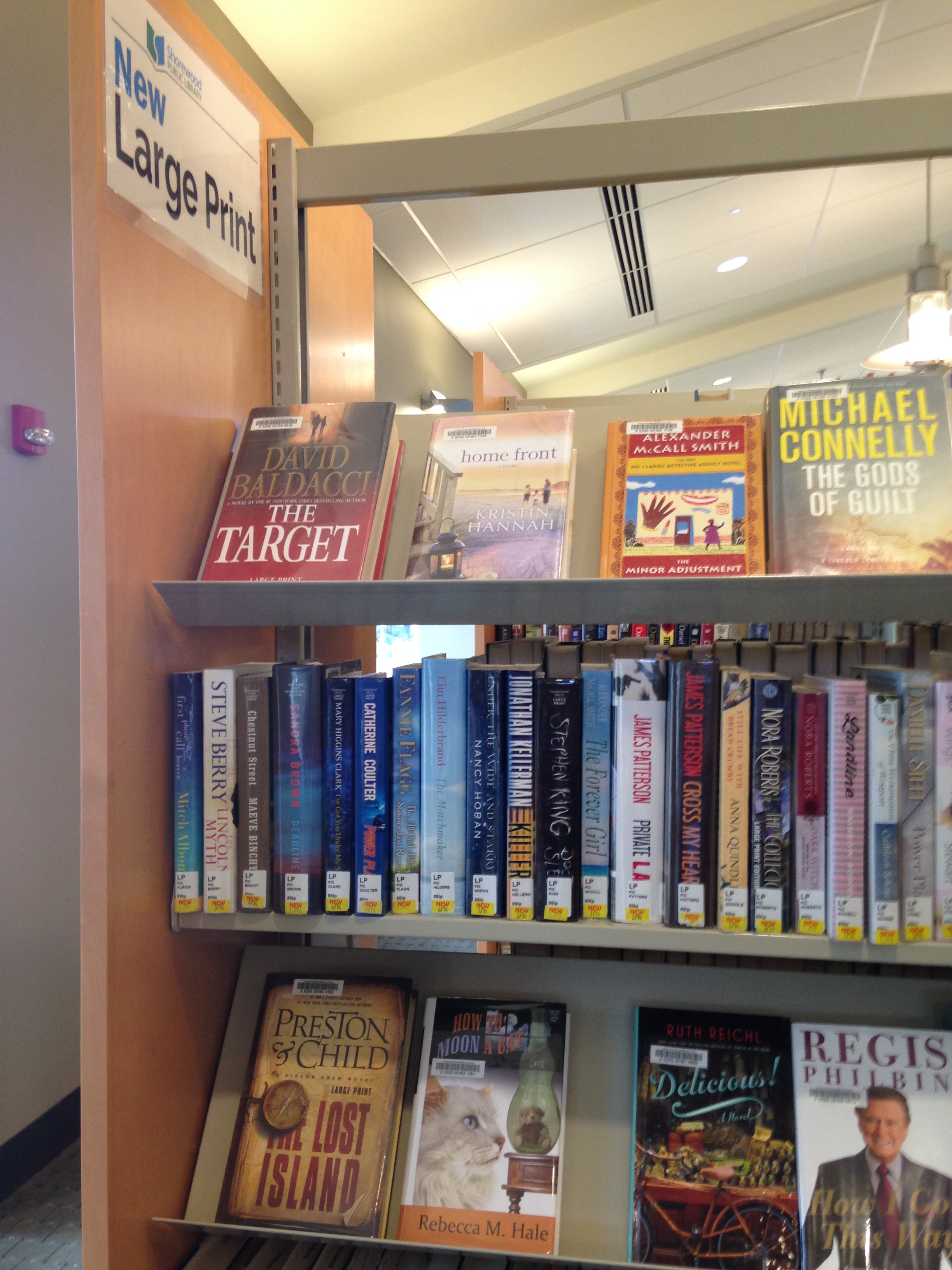 Large Print books may not be the most glamorous of the items on offer here at the library. But they are important for those of you who struggle with changing vision or vision loss, but still crave the solid feeling of a print book.