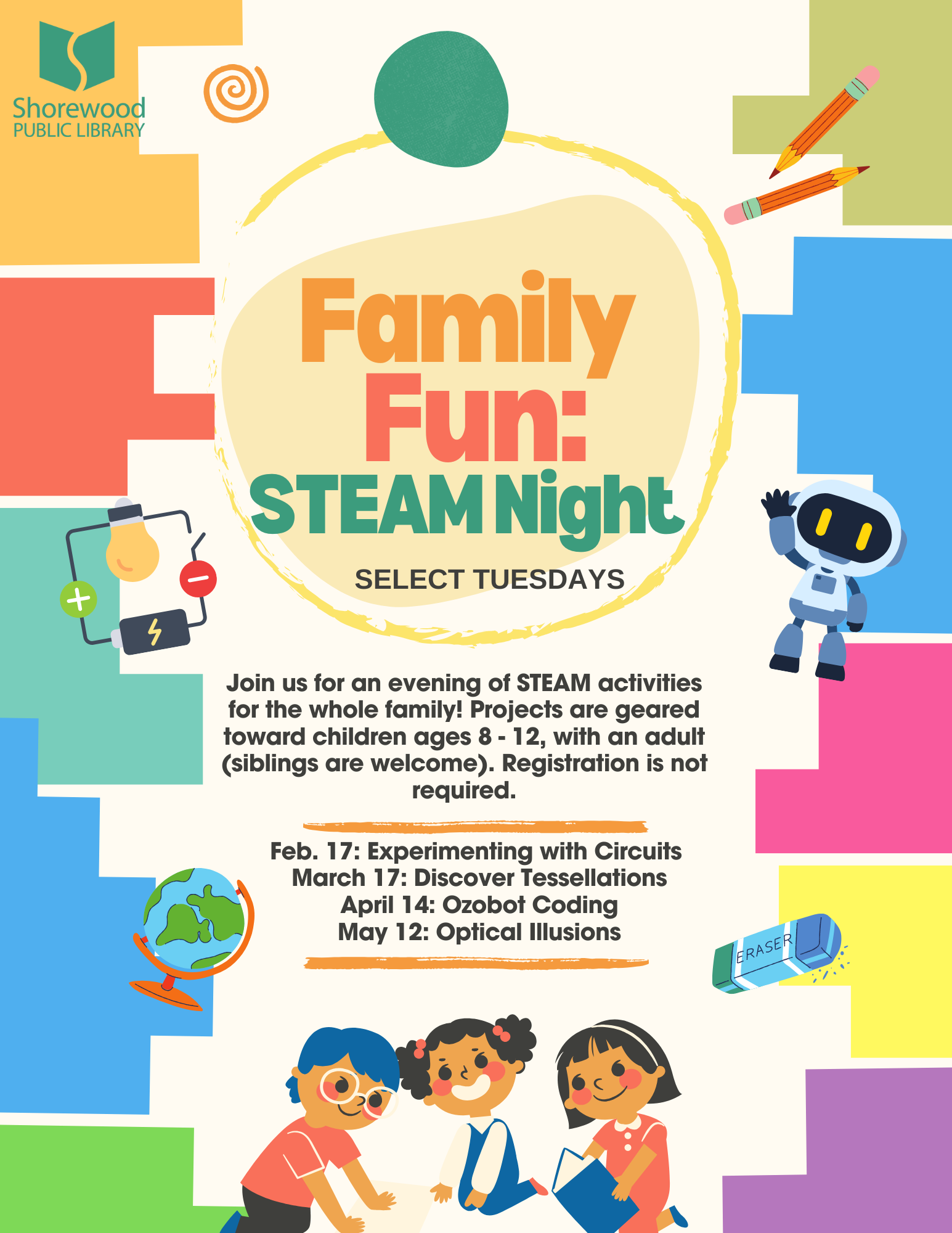 Join us for an evening of STEAM activities for the whole family! Projects are geared toward children ages 8 - 12, with an adult (siblings are welcome). Registration is not required.