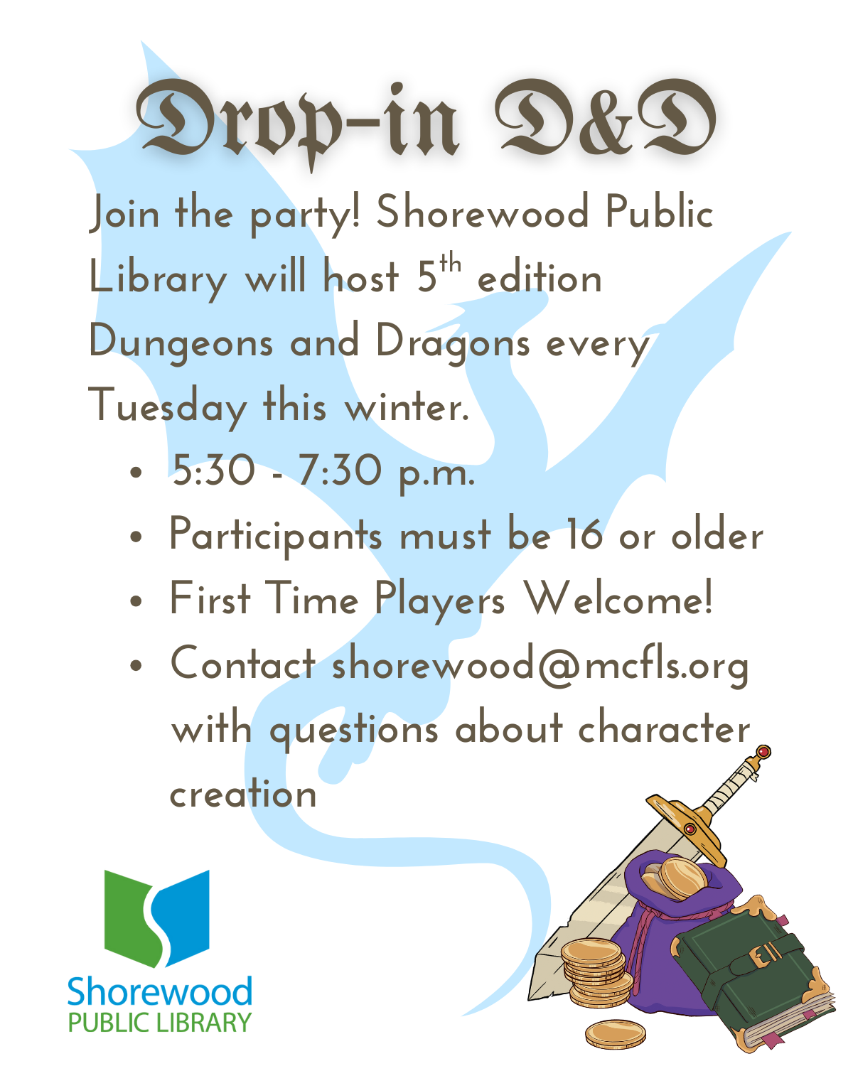 Join the party! Shorewood Public Library will host 5th edition Dungeons and Dragons every Tuesday this fall.
